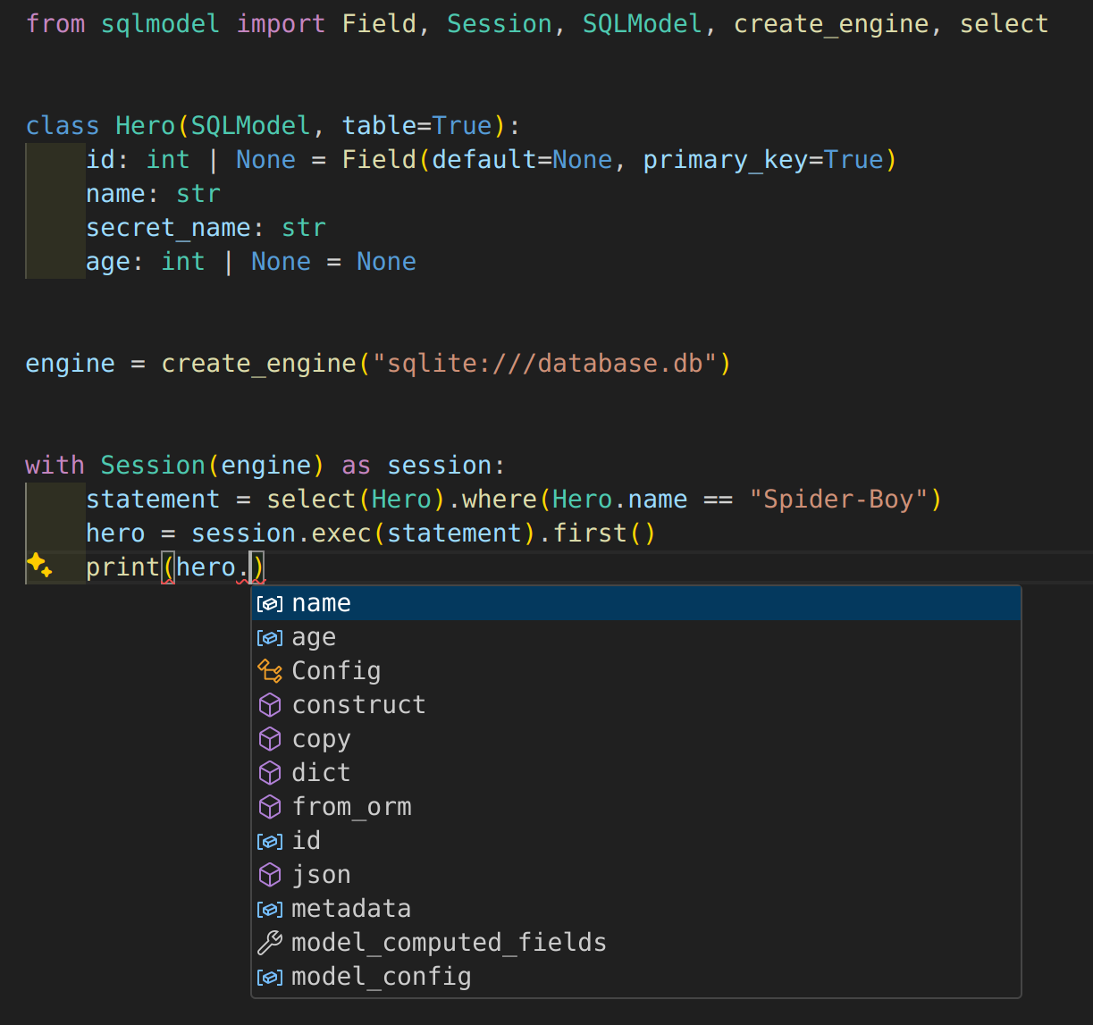 SQLModel was designed to be easy and intuitive to use to ensure the best development experience, with autocompletion everywhere.